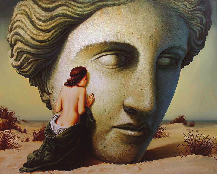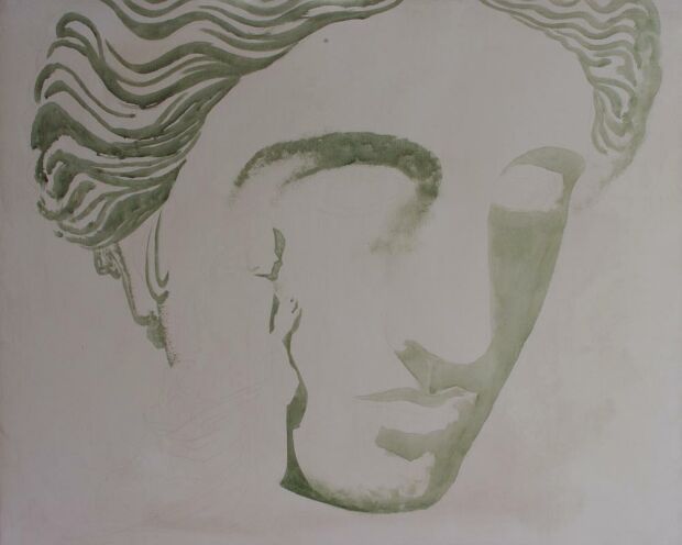 Das Projekt, bei dessen Entstehung ich dabei sein durfte war bereits vorbereitet. Er zeigte mir Skizzen, Studien, eine frisch grundierte Leinwand, 80x100cm und ein großes Blatt, sehr dünnes Papier in den Abmaßen der Leinwand. Ich erkannte darauf Umrisslinien eines großen Kopfes und eine weibliche Figur, die davor hockt und ihren Kopf an den übergroßen Kopf zu schmiegen scheint. Ein Teil dieser Umrisslinien, hatte er bereits mit zarten Bleistift Linien, auf die Leinwand übertragen.