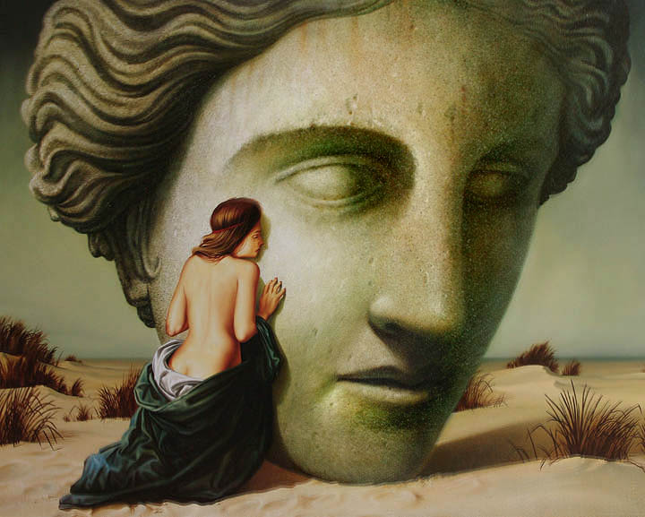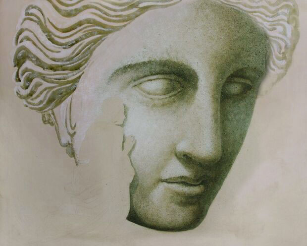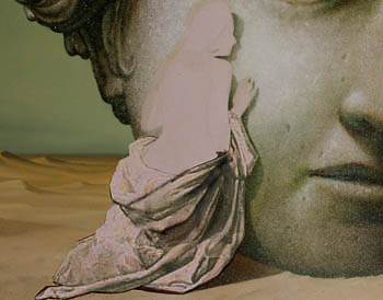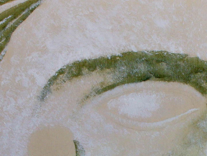 Das Acryl Weiß trocknet schnell und mit den beiden Ölfarben werden weitere Details angelegt, auch lasierend über das Acryl Weiß hinweg. Es kommt "Vandyckbraun" als zusätzliche Ölfarbe hinzu, später auch noch "Kadmiumgelb" und "gerannte Siena" für einige Details. Alles mit kleineren und größeren, groben Borsten Pinseln. Nach und nach entsteht ein Kopf mit einer Art Haaren, der seinen steinernen Charakter durch das grob getupfte Acryl Weiß und die teilweite getupften Ölfarben erhält. Diese Aktion hat ca. 1 1/2 Stunden gedauert. (siehe Abb. oben)