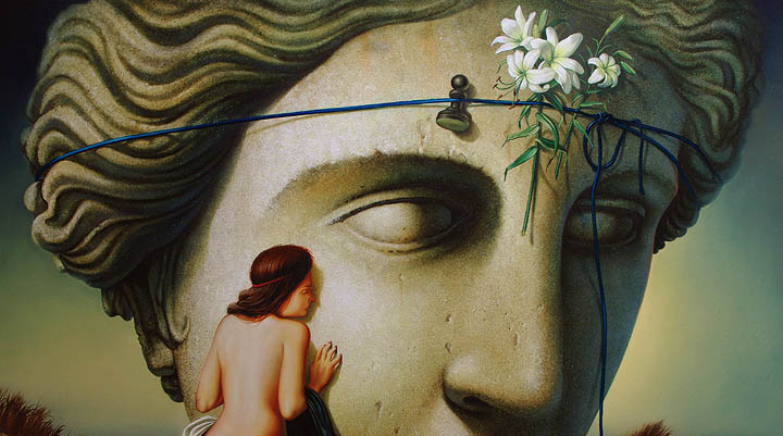 Es folgen diverse Details, auch am blauen Seil, da kommen Teile hinzu und auch an der Pflanze. Nun wird auch die Lilien Blüte detailliert gemalt. Der Himmel wird im oberen Bereich deutlich dunkler und die Lichter im Kopf werden brillanter. Es wird im Grunde das gesamte obere Teil des Bildes überarbeitet und um einige neue Elemente ergänzt. Zu Einsatz kamen diverse große und für die neuen Elemente, auch sehr kleine Pinsel. Dabei kommen nahezu alle der bereits bekannten Farben zum Einsatz.