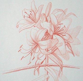 Dann brauche ich einen weißen Untergrund für die Blüten der weißen Lilien, sagt er und trägt an einigen Stellen reines "Titanweiß" auf. Dadurch das die weiße Farbe stellenweise deckend und Stellenweise kaum deckend aufgetragen wird ist bereits eine Blüte mit Licht und Schatten erkennbar.