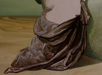 Wieder kommen die selben lasierenden Farben in unterschiedlichen Mischungen zum Einsatz. Diesmal verwendet er große Anstreicher Pinsel mit sehr wenig Farbe und erzeugt mit sehr durchsichtigen Farbschichten geringfügige Farbton Änderungen am Kopf. Der rechte Schatten Bereich des Kopfes wird blauer, der linke Teil gelber bis oranger indem er "Indischgelb mit "Oxydrotbraun" Vermischt und so fast den ganzen Kopf mit einer hauchdünnen, sehr durchsichtigen Farben überzieht. Mit einer Mischung aus "Ultramarin" und "Oxydrot" entsteht eine fast schwarze Farbe, die er ebenfalls sehr lasierend einsetzt. Der gesamte Kopf wirkt dunkler. Auch das Gewand wird großflächig dunkler. Es ist insgesamt eine großflächige Farbtonänderung, die er auch auf den Himmel und den Sand ausdehnt. Das alles mit sehr geringen Mengen der genannten, lasierenden Farben.