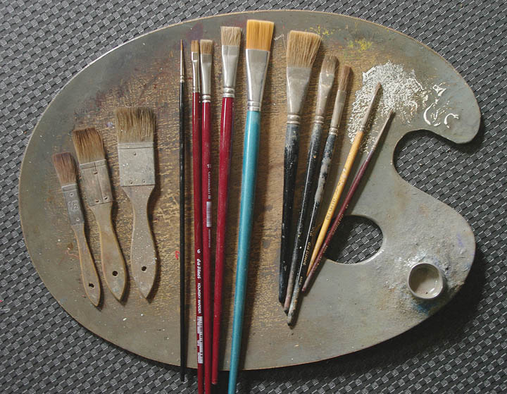 Dafür werden wieder große flache Rindshaar und große Borstenpinsel verwendet. Nur sehr selten auch kleine Pinsel für einige Details.
