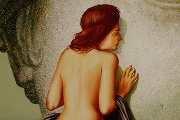 Er beginnt mit dem Körper der Frau. Der wird von beginn an detailliert und ausschließlich mit "Titanweiß", "Kadmiumgelb" und "gerannter Siena", angelegt. Das erste mal findet ein Malprozess über mehrere Stunden, hoch konzentriert und vorwiegend im Sitzen statt. Er verwendet kleine flache Rindshaar-Pinsel zum auftragen der Farben, die er auf der Palette anmischt. Größere, langhaarige Rotmarder Pinsel um diese zu vertreiben und auch sehr kleine spitze Rotmarder Pinsel für die Details.