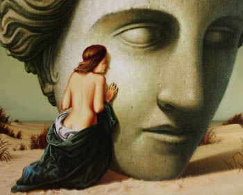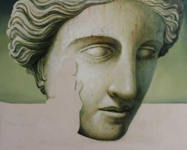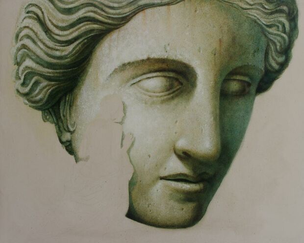 Das Acryl Weiß trocknet schnell und mit den beiden Ölfarben werden weitere Details angelegt, auch lasierend über das Acryl Weiß hinweg. Es kommt "Vandyckbraun" als zusätzliche Ölfarbe hinzu, später auch noch "Kadmiumgelb" und "gerannte Siena" für einige Details. Alles mit kleineren und größeren, groben Borsten Pinseln. Nach und nach entsteht ein Kopf mit einer Art Haaren, der seinen steinernen Charakter durch das grob getupfte Acryl Weiß und die teilweite getupften Ölfarben erhält. Diese Aktion hat ca. 1 1/2 Stunden gedauert. (siehe Abb. oben)