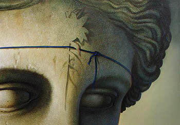 Während ich ihn beim malen der Blume und des Seiles beobachte, wie er mit verschiedenen, teilweise sehr kleinem Pinseln Linien zieht, Farben anmischt und auf der Leinwand ineinander vertreibt, kommt mir der Gedanke;... so ähnlich hatte ich mir eigentlich das malen am ganzen Bild vorgestellt. Die bisherigen Arbeiten, insbesondere am großen Kopf, erschienen mir viel grober als gedacht. Obgleich es auch hier bereits einige detaillierte arbeiten mit kleinen Pinseln gab, kamen doch sehr häufig recht große Borstenpinsel, wie sie auch Anstreicher verwenden, zum Einsatz. Das hatte ich mir so nicht vorgestellt. Trotzdem ist die Wirkung überraschend detailliert.