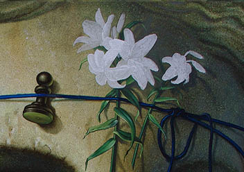 Dann geht es wieder an das Seil, für das er eine bisher noch nicht verwendete Farbe hinzu nimmt, "Preußischblau". Das vermischt mit Gelb wird auch für die Stengel und Blätter der Lilie verwendet. Alles mit recht kleinen Pinseln. Es entsteht auch eine am Seil eingeklemmte Schachfigur. (Abb. oben rechts)