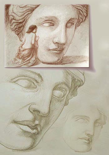 In unserem Beispiel beginnt er mit einem dünnen Farbauftrag, einer Mischung aus "Lichtem Oker" und "Paynesgrau", sehr stark verdünnt mit viel Terpentin und etwas Malmittel werden die Schatten Bereiche des großen Kopfes mit kleinen Rindshaar-flach Pinseln angelegt. (Siehe Abb. oben rechts)