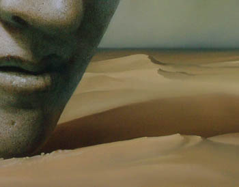 Aufgetragen werden die, indem die stark verdünnten Ölfarben mit einem kleineren Anstreicher Borstenpinsel über einen Pinsel Stiel gestreift werden, so das die Spritzer auf dem Kopf und dem Sand eine feine, gesprenkelte Struktur erzeugen. Nacheinander, erst die dunkle, dann die helle Farbe. Dabei liegt das Bild flach auf dem Boden und er deckt den Himmel Bereich mit Papier und Karton Schnipseln ab, damit dort keine Spritzer landen. Auf dem Sand landen nur ganz unten und im Schatten des Kopfes einige Spritzer.