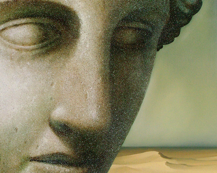 Wieder kommen die selben lasierenden Farben in unterschiedlichen Mischungen zum Einsatz. Diesmal verwendet er große Anstreicher Pinsel mit sehr wenig Farbe und erzeugt mit sehr durchsichtigen Farbschichten geringfügige Farbton Änderungen am Kopf. Der rechte Schatten Bereich des Kopfes wird blauer, der linke Teil gelber bis oranger indem er "Indischgelb mit "Oxydrotbraun" Vermischt und so fast den ganzen Kopf mit einer hauchdünnen, sehr durchsichtigen Farben überzieht. Mit einer Mischung aus "Ultramarin" und "Oxydrot" entsteht eine fast schwarze Farbe, die er ebenfalls sehr lasierend einsetzt. Der gesamte Kopf wirkt dunkler. Auch das Gewand wird großflächig dunkler. Es ist insgesamt eine großflächige Farbtonänderung, die er auch auf den Himmel und den Sand ausdehnt. Das alles mit sehr geringen Mengen der genannten, lasierenden Farben.