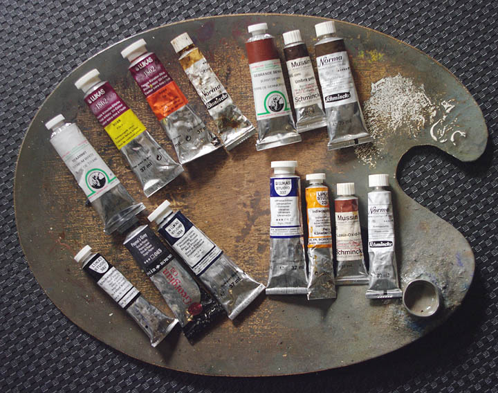 "Titanweiß", "Kadmiumgelb", "Lichter Oker", "gerannte Siena", "Vandyckbraun", "Paynesgrau", erst heute, zum Schluß kam "Kadmiumorange" hinzu.