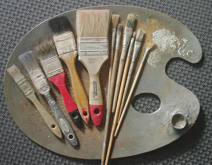 Dafür werden wieder große flache Rindshaar und große Borstenpinsel verwendet. Nur sehr selten auch kleine Pinsel für einige Details.